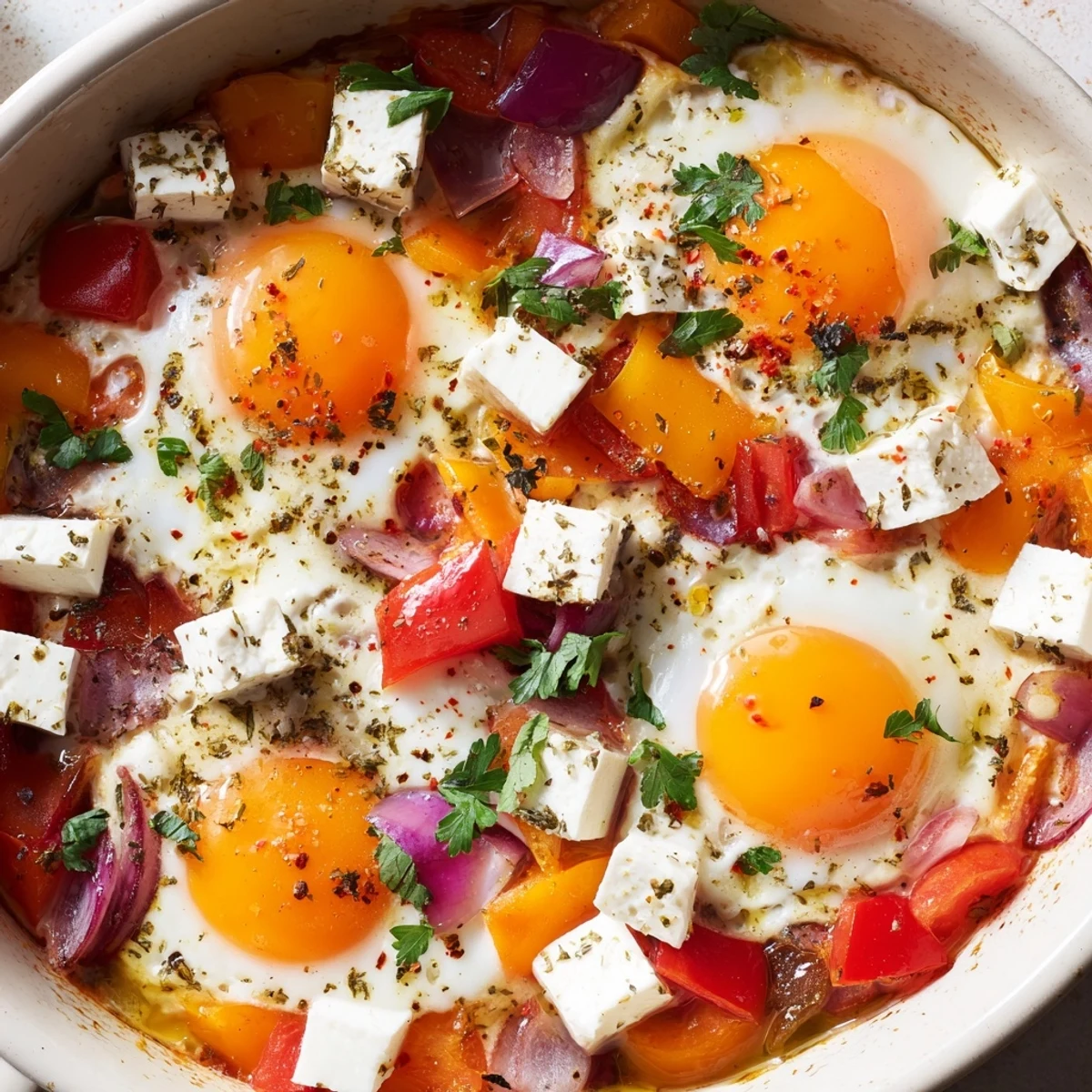 Best enjoyed fresh from the oven while the eggs are perfectly set and the feta is warm and creamy. Leftovers can be refrigerated and reheated, though the texture may change slightly.