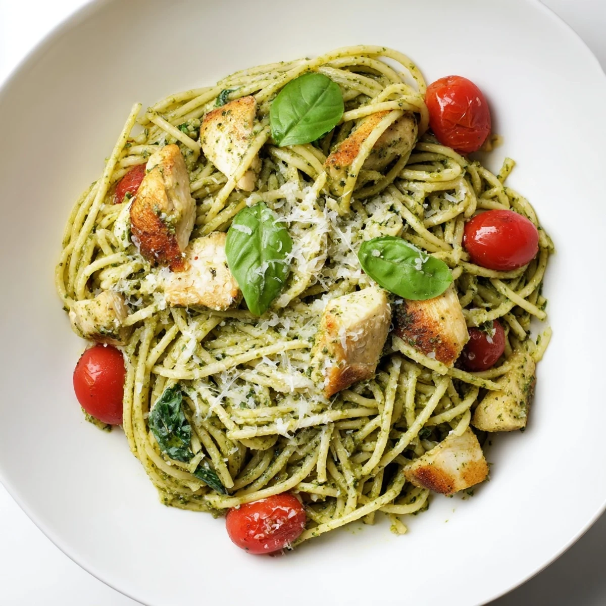 This wholesome Italian-inspired dish brings together succulent chicken breast with vibrant fresh basil pesto and perfectly al dente pasta. The homemade pesto combines aromatic basil, toasted pine nuts, garlic, and Parmesan for a classic Mediterranean flavor profile. Ready in just 35 minutes, this protein-packed meal delivers restaurant-quality results with minimal effort. The light coating of pesto creates a silky sauce that clings beautifully to each strand of pasta, while optional cherry tomatoes and baby spinach add color and nutrients. Perfect for weeknight dinners yet elegant enough for entertaining.
